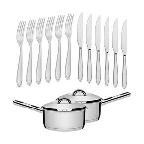 Muito importante:-- conferir produtos no ato do recebimento. Não aceitar produtos com embalagem violada amassado, rasgado, aberto, quebrado, etc , a recusa deve ser feita no ato.Conjunto de panelas solar 16cm 1,4l com 48 talheres de mesa laguna tramontinaComponentes do kit:24 un - 63906180 faca para churrasco laguna em aço inox - tramontina24 un - 63906020 garfo de mesa laguna em aço inox - tramontina2 un - 62501160 panela em aço inox linha solar fundo triplo 16 cm 1,4l pit7 - tramontina--- faca para churrasco laguna em aço inox - tramontina 63906180Garantia: 90 dias para vícios ou defeitos de fabricação- ideal para restaurante, lancheria, paderia, linha doméstica, residência, gourmet- acabamento em brilho, com detalhes no cabo- própria para uso diário combina com qualquer ambiente- pode ser lavada diariamente na máquina de lavar louças- peso líquido: 0,043 kg- peso bruto: 0,045 kg- dimensões embalagem : 0,8cm a x 2cm l x 23cm p- dimensões produto : 0,3cm a x 1,8cm l x 21cm p- espessura: 3,0 mm--- garfo de mesa laguna em aço inox - tramontina 63906020Garantia: 90 dias para vícios ou defeitos de fabricação- ideal para restaurante, lancheria, paderia, linha doméstica, residência, gourmet- próprio para uso diário combina com qualquer ambiente- pode ser lavado diariamente na máquina de lavar louças- peso líquido: 0,032 kg- peso bruto: 0,035 kg- dimensões embalagem: 2cm a x 2,5cm l x 20cm p- dimensões produto : 1,9cm a x 2,3cm l x 19,3cm p- espessura: 1,6 mm--- panela em aço inox linha solar fundo triplo 16 cm 1,4l pit7 tramontina 62501160Garantia: 90 dias para vícios ou defeitos de fabricação- pode ir ao forno em temperatura máxima de 260c, podendo haver mudança na coloração.- produto com certificação compulsória certificada pela ocp 0104- pcn do brasil, registro 001470/2018, conforme portaria inmetro 419/2012.Especificações técnicas:- altura sem tampa: 8cm- altura com tampa: 11cm- diâmetro externo: 18cm- diâmetro interno: 16cm- altura interna: 7cm- largura total: 33cm