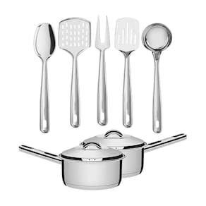 Componentes do kit: 1 un - 63815101 colher para arroz extrata 1 un - 63815091 concha terrina extrata 1 un - 63815221 espumadeira extrata 1 un - 63815391 espátula perfurada extrata 1 un - 63815471 garfo trinchante extrata 2 un - 62501160 panela em aço inox linha solar fundo triplo 16 cm 1,4l pit7 - tramontina