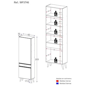 Dimensões do produto montado: Altura: 203cm | Largura: 62cm | Profundidade: 32cm *Você pode consultar as medidas internas na imagem técnica do produto.