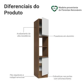As portas possuem dobradiças com amortecimento, que proporcionam fechamento suave e silencioso. Os pés possuem regulagem de altura e o rodapé removível facilita a limpeza.