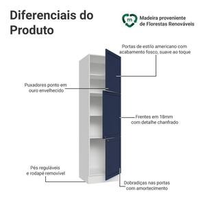 O acabamento fosco de alta resistência da estrutura é em Branco e das portas em Azul, refletindo o estilo americano com um toque moderno. Possui uma textura suave ao toque, trazendo leveza e sofisticação ao ambiente. O destaque vai para os puxadores ponto em ouro envelhecido, feitos com metal resistente, que adicionam personalidade e um charme único.
