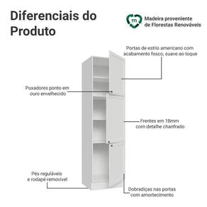 O acabamento fosco de alta resistência da estrutura e das portas é em branco, refletindo o estilo americano com um toque moderno. Possui uma textura suave ao toque, trazendo leveza e sofisticação ao ambiente. O destaque vai para os puxadores ponto em ouro envelhecido, feitos com metal resistente, que adicionam personalidade e um charme único.