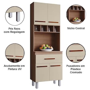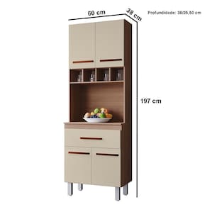 Paneleiro Alto Com Nicho 4 Portas 1 Gaveta Vitorina Savana / Off White O Paneleiro Alto 4 Portas 1 Gaveta Vitorina é a escolha ideal para quem busca praticidade e elegância na cozinha. Com design moderno e acabamento de qualidade, ele oferece amplo espaço interno para organizar panelas, utensílios e mantimentos, mantendo tudo sempre ao alcance das mãos. Suas portas e gaveta garantem fácil acesso e ajudam a deixar o ambiente mais funcional e harmonioso. Um móvel versátil que une beleza, organização e durabilidade no seu dia a dia. Dimensões do Paneleiro de Cozinha 4 Portas 197 cm: Altura: 197 cm Largura: 60 cm Profundidade: 38/25,5 cm