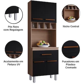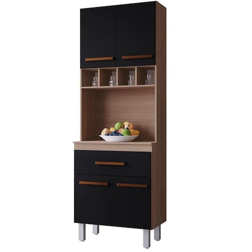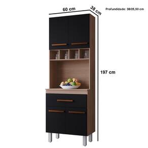 Paneleiro Alto Com Nicho 4 Portas 1 Gaveta Vitorina Savana / Preto O Paneleiro Alto 4 Portas 1 Gaveta Vitorina é a escolha ideal para quem busca praticidade e elegância na cozinha. Com design moderno e acabamento de qualidade, ele oferece amplo espaço interno para organizar panelas, utensílios e mantimentos, mantendo tudo sempre ao alcance das mãos. Suas portas e gaveta garantem fácil acesso e ajudam a deixar o ambiente mais funcional e harmonioso. Um móvel versátil que une beleza, organização e durabilidade no seu dia a dia. Dimensões do Paneleiro de Cozinha 4 Portas 197 cm: Altura: 197 cm Largura: 60 cm Profundidade: 38/25,5 cm