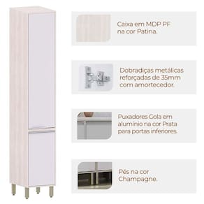 • Pintura: 4 Prateleiras Internas em Patina FF; Dobradiças Metálicas 35 mm com Amortecimento; 2 Puxadores Gola em Alumínio Prata (Anodizado);