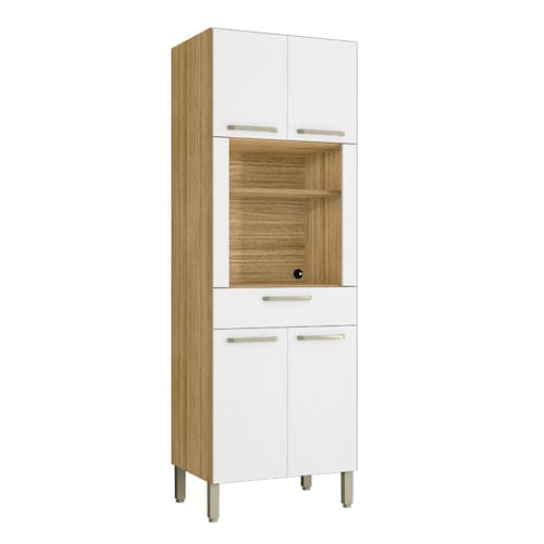 Produzido em MDP de 15 mm., madeira reconstituída provinda de reservas manejadas para este fim, é um produto ecologicamente correto. Nas quatro portas e na ampla gaveta são utilizadas dobradiças 100% metálicas e corrediças telescópicas que garantem facilidade e segurança no abrir e fechar das portas e gavetas. Dispõe de amplo espaço interno para melhor organizar os objetos da cozinha, além de um nicho para microondas e prateleira para pequenos objetos ou decoração acima do microondas. Os puxadores são ergônomicos em plástico resistente. Em sua base utiliza pés reguláveis em plástico resistente que propicia perfeita montagem mesmo em pisos com pequenos desníveis. Um produto que certamente irá ajudar na organização de sua cozinha, aproveitando muito bem os espaços.