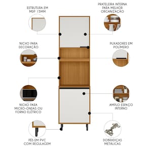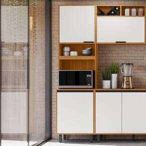 Para otimizar ainda mais o seu espaço, o Paneleiro Torre Quente conta com um Nicho Para Micro-ondas ou forno elétrico, além de um Nicho decorativo, perfeito para expor seus itens favoritos com destaque. Com duas prateleiras internas, tem amplo espaço para acomodar utensílios, louças e mantimentos de forma prática e eficiente.
