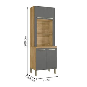 Produzido em MDP de 15 mm., madeira reconstituída provinda de reservas manejadas para este fim, é um produto ecologicamente correto. Nas quatro portas são utilizadas dobradiças 100% metálicas que garantem facilidade e no abrir e fechar das portas. Dispõe de amplo espaço interno para melhor organizar os objetos da cozinha, além de um micho para microondas e forno elétrico. Os puxadores são ergônomicos em plástico resistente. Em sua base utiliza pés reguláveis em plástico resistente que propicia perfeita montagem mesmo em pisos com pequenos desníveis.