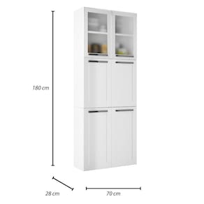 - Cor: Branco Neve - Material da Estrutura: Aço - Revestimento: Pintura Eletrostática a pó de alto brilho e resistência - Escala de Brilho: Semibrilho - Quantidade de portas: 6 (2 em vidro) - Quantidade de prateleiras: 6 - Material dos puxadores: ABS com acabamento cromado - Dobradiças Metálicas 26mm: Metálica - Material dos puxadores: Plástico metalizado. Puxadores ABS com acabamento cromado.