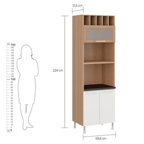 O paneleiro possui 2 portas, 1 porta de vidro, espaço para forno, forno microondas, além de espaço adega. Os compartimentos são perfeitos para armazenar mantimentos e utensílios, otimizando ao máximo o espaço de sua cozinha.