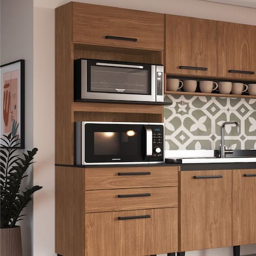 O Kit Duplo Giovanna é um produto com excelente qualidade, produzido em MDP de fácil montagem, portas fixadas com dobradiças metálicas, puxadores pretos e possui espaço para dois fornos. Facilitando a organização dos seus utensílios em geral, possui também pés com regulagem de altura deixando assim sua casa com um ambiente mais moderno e aconchegante. Acabamento da Gaveta: Laca Acabamento da Porta: Impressão Acabamento da Prateleira: Impressão Acabamento dos Pés: Polipropileno Acompanha Rodapé Decorativo: Não Altura dos Pés: 20 cm Ambiente Principal: Cozinha codigo_ean: 7900288097736 Complexidade da Montagem: Média: pode ser montado por mais de uma pessoa e/ou necessite de maior conhecimento para montagem Cor: Freijó/Preto Cor do Produto: Freijo/Preto Cor dos Pés: Preto Cor Flex: NÃO Cor Interna: Freijo Escala de Brilho: Semi-Brilho Escala de Brilho da Gaveta: Brilhante Escala de Brilho da Porta: Brilhante Escala de Brilho da Prateleira: Semi-Brilho Gaveta com Chave: Não Itens Inclusos: 1 Kit Duplo, 1 Kit Ferragem + Manual de Montagem Linha ou Coleção: Linha Giovanna Manual de Montagem e Instalação: https://product-hub-prd.madeiramadeira.com.br/981449/documents/cdd4153d-440a-470e-8af7-4b373d33c4ee2744841400017419776251779.pdf Marca: IRM Material da Corrediça: Metálica Material da Dobradiça/Corrediça da Porta: Metálica Material da Gaveta: MDP Material da Porta: MDP Material da Prateleira: MDP Material do Puxador da Gaveta: Poliestireno Material do Puxador da Porta: Poliestireno Material dos Pés: Polipropileno Montagem Flex: NÃO Necessita Montagem: Sim Origem do Produto: Nacional Pés Reguláveis: Sim Peso: 38,5 kg Peso Máximo por Gaveta: 4 kg Peso Máximo por Prateleira: 6 kg Possui Espelho: Não Possui Possui Pés: 04 Possui Portas: 02 Possui Prateleiras: 02 Possui Rodízio: Não Recomendações de Uso, Manutenção e Limpeza: Para limpeza utilize pano macio levemente umedecido em água seguido de pano seco. Sapatas Niveladoras: Não Sistema de Montagem: Parafusos, cavilhas e cantoneiras Tipo de Corrediça da Gaveta: Simples Tipo de Dobradiça/Corrediça da Porta: Simples Tipo de Paneleiro: Paneleiro Forno Tipo de Puxador da Gaveta: Externo Tipo de Puxador da Porta: Externo