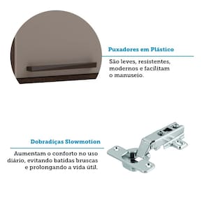 Estrutura: MDP 15mm Acabamento da Caixaria/Corpo: PF Acabamento das Portas/Frontal: PF Quantidade e Tipo de Portas: 4 de Bater Tipo de Dobradiças: Metálicas Slowmotion Tipo de Puxadores: Plástico Champagne Quantidade de Prateleiras: 5 Tipo de Pés: Plástico *PS com regulagem de altura - *Poliestireno Garantia: 3 meses Sistema de Montagem: Cavilhas e Parafusos Itens inclusos: Paneleiro, manual de montagem, ferragens e acessórios
