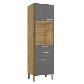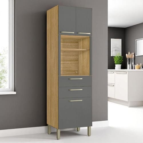 O Paneleiro possui três gavetas de tamanhos distintos que permitem liberdade para melhor organização do espaço, além de nicho para eletrodomésticos diversos e duas gavetas com ampla abertura garantida pelas corrediças telescópicas, para fechar, conta com puxadores ergonômicos feitos em plástico resistente.