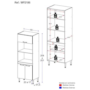 Dimensões do produto montado: Altura: 204cm | Largura: 70cm | Profundidade: 51,5cm *Você pode consultar as medidas detalhadas na imagem técnica do produto.