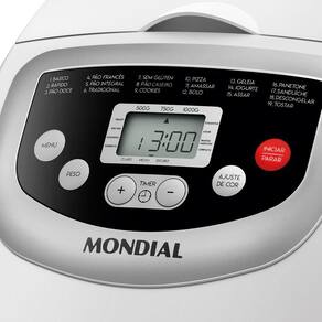 A Panificadora Automática Master Bread Mondial prepara diversos tipos de pães, bolos, pizzas, panetones, além de fazer geleia, iogurte, tostar castanhas e muito mais. O painel digital te possibilita iniciar os preparos com apenas 1 clique e possui 19 opções pré-programadas. Conta com ajuste de tonalidade e de peso, função timer para programar seu tempo e potência de 700W. 19 FUNÇÕES PRÉ-PROGRAMADAS: Prepare receitas com apenas um clique! São 19 funções programadas para o preparo de diversos tipos de pães, bolos, massas e muito mais. PAINEL DIGITAL: Facilita a escolha do tamanho dos pães, ciclos e timer para a produção. VERSATILIDADE DE RECEITAS: Prepara pães, bolos, pizzas, panetones, iogurtes, geleias e muito mais. AJUSTE DE TONALIDADE: Possibilita escolher o tom do pão que preferir: claro, médio ou escuro. FUNÇÃO TIMER: Permite programar os preparos com até 15 horas de antecedência. VISOR DE ACRÍLICO: Garante mais praticidade para visualizar e acompanhar o preparo das receitas. SELETOR DE PESO: Selecione entre pequeno 500g , médio 750g e grande 1kg . FORMA REMOVÍVEL: Com revestimento antiaderente, facilita a retirada dos alimentos e a hora da limpeza. - Especificações: Comprimento do cabo: 1,50m Tipo de tomada: 10A Potência: 700W Dimensões do produto: 29,50cm x 28,00cm x 33,50cm AxLxP Cor: branco Ean: 7908259503293