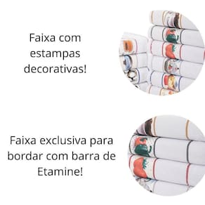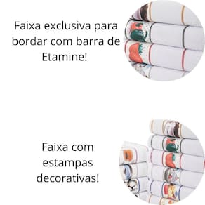 Estampas do kit pano de prato atoalhado As estampas do kit pano de prato atoalhado são bem sortidas e um pouco acima tem uma barra feita em etamine, para você usar a sua criatividade e bordar, deixando a sua cozinha do seu jeitinho e com isso mais charmosa