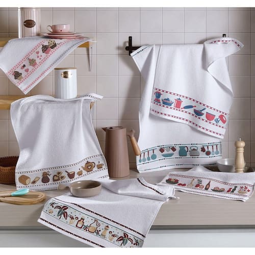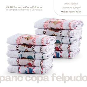 KIT 10 PANOS DE COPA FELPUDOAs estampas vibrantes e variadas incluem temas divertidos e acolhedores como café, cupcakes, temperos, tigelas, tomates e colheres, trazendo charme e personalidade ao seu espaço. São ideais para quem busca aliar funcionalidade a um toque decorativo único na cozinha.Quantidade de Peças e Medidas Aproximadas (Largura x Comprimento):10: Kits de Panos de Copa 46cm x 70cmMaterial e Composição:100% Algodão e Gramatura 300g/m²Informações Específicas:Toalha HipoalergênicaLavar antes de usar pela primeira vez para retirada de resíduos de fabricaçãoNão utilizar amaciantes nas primeiras lavadasNão usar alvejantesCores escuras devem ser lavadas separadamenteEvite lavar juntamente com tecidos abrasivos para evitar o surgimento de bolinhasInformações Gerais:- Material visual ilustrativo;- Pode haver alterações na tonalidade da cor da imagem do produto, devido a diferença de telas de visualização;- Fique atento(a) à descrição do produto, podendo não apresentar todas as peças que constam no material visual;- Garantia contra defeito de fábrica. Marca: Não Informado