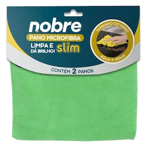 Pano de microfibra 40x40cm pacote com 2 unid. verde Slim - Nobre Panos em microfibra são considerados os mais eficientes do mercado. Ele não solta pó e retém sujeiras de modo mais efetivo que os panos Tradicionais. São eletrostáticos, tornando a limpeza mais prática, pois a sujeira também gruda na microfibra.
