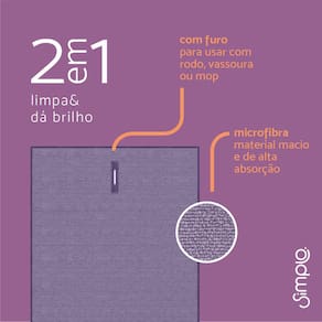 "Conheça o Pano de microfibra para chão com furo da Simplo.Prático e durável, é ótimo para secar e limpar superfícies e é ideal para limpar e secar pisos lisos frios, sintéticos ou madeira.Proporciona uma limpeza com menos esforço, água e produtos químicos! Possui alta absorção, não solta fiapos e atrai e retém poeira. Além disso, tem furo para usar com rodo, mop ou vassoura.São 100% de microfibra. Antes de guardar, lave bem e coloque para secar na sombra. Pode limpar em máquina de lavar, sem amaciante e sem misturar com tecidos que soltam fiapos. Não use em superfícies ásperas, não utilize alvejante e nem coloque em secadora ou lave a seco. Mantenha longe de fontes de calor.Leve funcionalidade e modernidade para sua casa!É só passar o cabo do rodo, mop ou vassoura pelo furo e envolver a base com o pano.Utilize seco para tirar o pó e secar.Utilize úmido para limpar. Ideal para limpar e secar pisos lisos frios, sintéticos ou madeira.- Com furo para usar com rodo, mop ou vassoura.- Limpeza com menos esforço, menos água e menos produtos químicos- 100% microfibra- Eletrostática: atrai e retém a poeira- Alta absorção: absorve até 8x o seu peso em água- Durável- Não solta fiaposÉ simplo. A microfibra tem fios muito finos (100x mais finos que fio de cabelo!). Isso faz com que até as menores sujeiras sejam retiradas por ela.Antes de usar, garanta que os panos estejam limpos - a sujeira pode arranhar objetos. Antes de guardar, lave bem e coloque para secar na sombra.Pode:- Ser lavado na máquina de lavar (até 40°C, sem amaciante e sem misturar com tecidos que soltam fiapos).Não pode:- Usar em superfícies ásperas.- Deixar no sol ou perto de outras fontes de calor.- Limpar superfícies ásperas, usar alvejante, colocar na secadora ou lavar a seco." Marca: SIMPLO