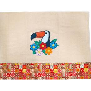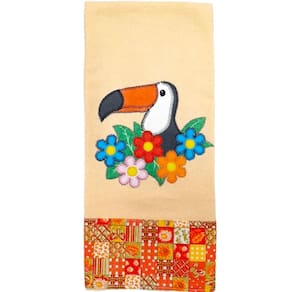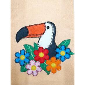 Cor: tecido laranja, patchwork de tucanos
