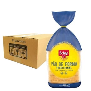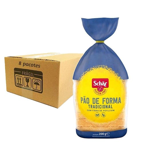 Pão de Forma Tradicional sem Glúten Schar 200g 8 Pacotes O Pão de Forma Tradicional da Schar é perfeito para quem busca uma opção de pão fresco, macio e saboroso, mas precisa evitar o glúten e a lactose. É ideal para preparar deliciosos sanduíches e é livre de transgênicos, conservantes e outros aditivos artificiais. Além disso, é apto para veganos e não contém ovos. Ingredientes:Água, amido de milho, farinha de arroz, fibra vegetal psyllium , espessante: hidroxipropilmetilcelulose; óleo de girassol, proteína de soja, fermento biológico, sal, fibra de cítricos, açúcar, acidificante: ácido cítrico.Alérgicos: Contém derivados de soja. Não contém glúten. Ficha Técnica:Peso: 200gBenefícios: Sem GlútenSem TrigoSem Lactose/LeiteSem OvosSem ConservantesApto para VeganosConteúdo da Embalagem: 01 pacote de 200gInformações Importantes:Imagens meramente ilustrativas. Algumas das embalagens podem sofrer alterações pelo fornecedor, sem haver tempo hábil para ser atualizada, porém, garantimos que as características do produto quantidade, peso, matéria prima e funções não serão alteradas. Marca: Scharr