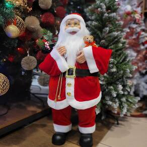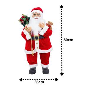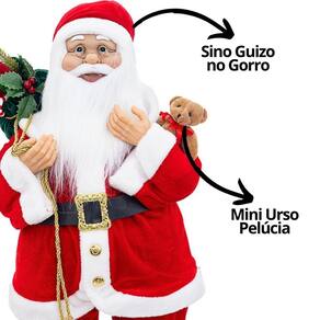 Adicione o símbolo máximo do Natal com este Papai Noel decorativo gigante, medindo 80 cm de altura. Vestido com um luxuoso traje em veludo vermelho tradicional com detalhes em pelúcia, ele traz consigo um adorável urso de pelúcia e um saco cheio de presentes, prontos para encantar a todos. Esse Papai Noel é ideal para criar uma atmosfera mágica e acolhedora em qualquer ambiente.