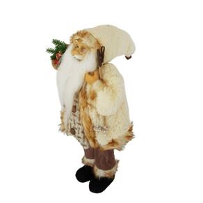 Papai Noel em pé com saco de presentes nas costas, estrutura em Polipropileno com 45 cm de altura, Casaco e Toca de lã, Colete de poliéster com botões, Calça de feltro com barras em Pele artificial e saco de Ráfia.