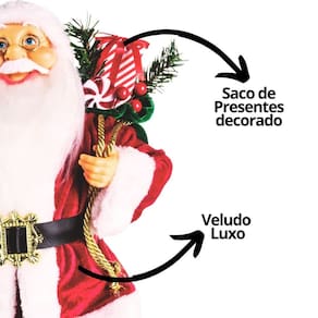01 Papai Noel Decorativo em Veludo Vermelho Premium com saco de presentes decorado