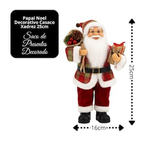 O modelo apresenta casaco xadrez vermelho e verde, gorrinho com guizo e um saco de presentes decorado, que completam o visual festivo do bom velhinho. Ideal para compor mesas, prateleiras, aparadores ou complementar a decoração da árvore de Natal, trazendo alegria e aconchego ao ambiente.