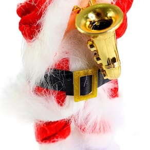 A grande novidade é que ele está tocando um saxofone dourado, que adiciona um elemento sofisticado e divertido à sua apresentação. Quando ativado, o Papai Noel começa a tocar uma canção natalina animada, enquanto o saxofone em suas mãos se movimenta de forma suave e ritmada, criando uma performance encantadora. Seu corpo é articulado para permitir movimentos coordenados, fazendo com que o saxofone balance de maneira realista ao ritmo da música.