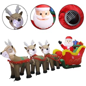 Papai Noel inflável de Natal de 9,5 pés MorTime em trenó puxado por três renas com caixas de presente, decoração de jardim iluminada com luzes LED para decorações externas de Natal - Design inovador - Papai Noel inflável de Natal de 9,5 pés em trenó Puxado por três renas com caixas de presente apresenta o Papai Noel sentado no trenó puxado por três lindas renas, trazendo muitos presentes para as pessoas. - Warm Glow - Basta conectar a uma tomada elétrica, ela funcionará perfeitamente. É especialmente atraente à noite. O adorável e brilhante Papai Noel leva um alce a distribuir presentes para humanos gentis. - Boa estabilidade - As decorações externas infláveis de Natal da MorTime são equipadas com uma base resistente para garantir a segurança e a estabilidade. Ele pode suportar o vento geral sem oscilações, é durável, à prova d'água e não é fácil de ser danificado. - Fácil configuração e armazenamento - Quando configurado, conecte à fonte de alimentação, o ventilador embutido funcionará perfeitamente para fornecer uma imagem realista do Papai Noel em um minuto. Se você não o usar, deixe o ar sair e dobre-o, ele não ocupará muito do seu precioso espaço! - Mostre o espírito natalino - sugere a generosidade e a satisfação do inverno e reflete a personalidade do proprietário, adicionando uma adição divertida às atividades hilárias. Pode chamá-lo de atenção na entrada de shoppings, parques de diversões ou restaurantes.