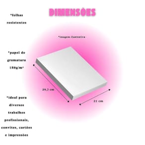 É um papel perolado, multiuso no formato A4, na gramatura 180g/m², ideal para elaboração de convites, lembranças, cardápios, embalagens e outros.