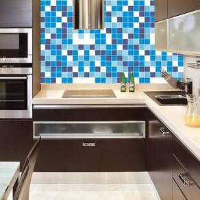 Papel de parede azul piscina pastilhas cozinha banheiro