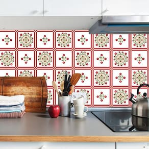 Papel de parede azulejo flores vermelhas cozinha e banheiro