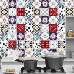 Papel de parede azulejo vermelho e azul cozinha lavatório