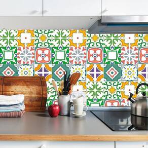 Papel de parede azulejo vermelho verde laranja cozinha pia