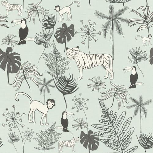 Você já descobriu o tigre? Ou o tucano em seu galho? Sem mencionar o macaco, que parece bastante amigável. No azul do papel de parede texturizado, os animais em preto e branco se sentem visivelmente bem. São moldados por diferentes folhas e plantas que se desenvolvem na parede. Vamos para uma aventura na selva?