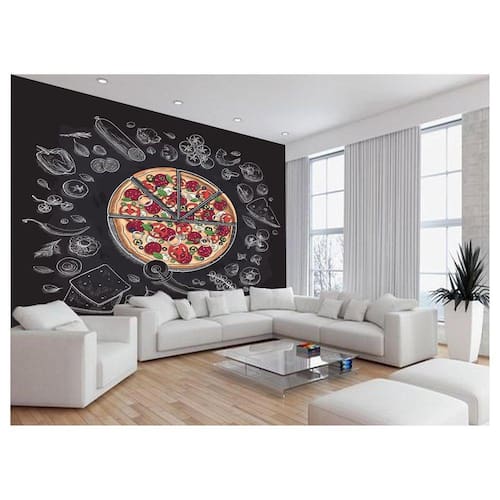 A impressão é feita em vinil adesivo. É um material lavável, impermeável, autocolante e antimofo. O produto cobre uma área de 3,50m, contando com 1,75 metro de altura por 2 metros de largura.