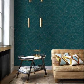 A folhagem tracejada nesse papel de parede faz com que a cor do plano de fundo seja mais predominante. Perfeito para quem também gosta do minimalismo.