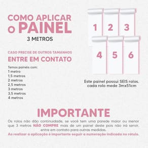 Atenção leia a descrição Valor do anúncio corresponde a 1 painel de: 3m largura x 3m altura , divididos em 6 rolos de 51cm x 3m.Isso equivale a 9m de coberturaNão precisa utilizar cola para realizar a instalaçãoPainel adesivo liso, não possui textura nem relevo 3d.Impressão em adesivo alto brilhoAntes de instalar orientamos abrir os rolos e simular a montagem no chão, garantindo que o painel será montado na ordem correta da estampa comprada. Qualquer problema ou dúvida, favor entrar em contato antes da instalação não aceitamos devolução de produto utilizados .Casa nova sem reformaImagine você mesmo transformando e decorando um cantinho especial de sua casa ou trabalho. O painel colaí é versátil, prático, fácil de aplicar e com baixíssimo custo. Paredes lindas e decoradas sem dores de cabeçaVantagens: Aplicação rápida, fácil e sem sujeira; Não precisa de cola; Lavável com pano macio umedecido em água e sabão neutro e resistente à água; Antimofo e antibacteriano; Não tóxico Antichamas Sobreposição de 1cm e continuidade dos desenhos para facilitar a emenda do próximo rolo. Dados técnicos do produto:- formato painel montado: 3m x 3m- acompanha 6 rolos de 0,51m x 3m- material: vinil brilho- tipo: autocolante- espessura: 0,08mm- características relevantes: não tóxico, isento de metais pesados, não propaga fogo, resistente a água, antimofo e antibactérias Formatos disponíveis em outros anúncios: largura x altura 1m x 3m 1,5m x 3m 2m x 3m 2,5m x 3m 3m x 3m 3,5m x 3m 4m x 3m Não recomendamos Aplicação em paredes com umidade, infiltrações, bolor, poeira e gordura; Aplicação em superfícies com texturas; Aplicação direto no reboco; Aplicação em superfícies com tinta escura; Aplicação direta em churrasqueiras e ambientes com altas temperaturas; Aplicação no chão. Aplicação em paredes com tinta lavável, fosca ou a óleo, devido a componentes presentes na tinta que interferem na fixação do papel de parede-onde posso aplicar Em paredes ou lajes lisas e pintadas com aplicação de massa corrida ; Em paredes ou forros de gesso pintadas; Em azulejos de cozinhas, banheiros ou lavanderias sem qualquer tipo de porosidade ou relevo área seca ou molhada ; Em portas ou móveis de madeira e/ou aço com a superfície plana e lisa; Em azulejos pode ser que fique relevo dos rejuntes aparentes, isso é normal. Paredes próximas a pia Paredes próximas a fogão e forno Em vidros e espelhos. Em mármores lisos, sem porosidade. Em áreas internas e externas.-cuidados durante a aplicação: Realizar um teste de fixação do adesivo em sua parede antes da aplicação do rolo, indicamos recordar o cabeçalho do papel de parede e fixar em sua parede, deixar por 24h para testar a fixação do mesmo. Colar alguns rolos na parede ou no chão, com fita crepe e conferir de longe a sobreposição dos rolos e a junção das estampas. Ao instalar o adesivo não pressioná-lo com força, pois pode deformar a estampa e impossibilitar a junção das estampas nos rolos seguintes.-cuidados após a aplicação: Evite raspar móveis ou objetos cortantes; Não use água sanitária ou outros produtos abrasivos. Limpeza somente com água, sabão neutro e esponja macia. Em banheiros e cozinhas, cuidado derrubar produtos nos papéis, pois alguns deles podem conter componentes químicos que poderão manchar.Trocas e devoluções: Caso seja efetuada uma segunda compra do mesmo produto e houver diferença na tonalidade, não aceitaremos a trocaP300