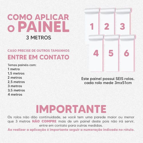 Antes de instalar orientamos abrir os rolos e simular a montagem no chão, garantindo que o painel será montado na ordem correta da estampa comprada. Qualquer problema ou dúvida, favor entrar em contato antes da instalação não aceitamos devolução de produto utilizados .