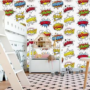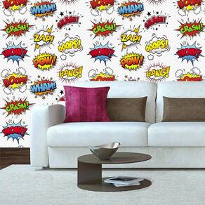 Papel de parede wow zap pow smash bang ooops wham boom 1 unidade rolo tem 3,00 altura mt x 52 largura cm . Observação: há possibilidade de variação de cor em até 15%, devido à calibração dos monitores ou telas de smartphones e tablets. Não necessita de aplicação com cola, pois é autoadesivo. Basta destacar a proteção e aplicar sobre a superfície desejada. Trabalhamos com adesivo vinil fosco liso, sem brilho, o produto não possui relevos e texturas. Nesse anuncio ensinamos como calcular a quantidade desejada para decorar seu ambiente. No final dessa descrição ensinamos como fazer o cálculo. Pode ser aplicado em superfície lisa e limpa preparada com massa corrida, como: paredes de gesso, com pintura acrílica, acetinada ou látex, balcões, vidros, azulejos, decoração portas, divisórias, moveis, objeto de madeiras, mdf, espelhos, geladeiras entre outros. Fabricamos os adesivos com uma sobreposição de 1 cm. No momento da aplicação uma parte deve sobrepor o outro 1 cm assim dando um encaixe perfeito no seu ambiente. Outra qualidade também que nosso papel é resistente água, antibactéria, anti-mofo e não propaga chamas. Acompanha manual de instalação, espatula e link de vídeo ensinando como fazer a aplicação Dados técnicos do produto: Tamanho medida cada rolo: 3,00 altura x 52 largura Área de cobertura: 1,56m² Tinta: não tóxica / sem cheiro Material: vinil fosco pvc liso Imagem: impresso em alta resolução Sobreposição de imagem: 10 mm ou 1 cm Tipo: autocolante Espessura: 0,08mm Tempo de secagem ou manuseio após a instalação: imediata Como calcular a quantidade necessária. » 1º passo: calculado a medida de 01 rolo Exemplo: 1 rolo de 0,52 m largura por 3,00 m altura irá cobrir uma área 1,56m² de parede 0,52 x 3,00 . » 2º passo: calculando a área da parede Se sua parede tem por exemplo, 3,40 m largura por 2,7 m altura , você tem uma área total de 9,18m² 3,40 x 2,70 para revestir com o papel de parede. » 3º passo: calculando a quantidade de rolos Se a parede que desejamos revestir tem 9,18m² e 1 rolo de papel cobre 1,56m², vamos dividir 9,18 por 1,56. O resultado será 5,88 rolos. Quando a medida não é exata, arredondamos para cima. Sendo assim, vamos precisar de 6 rolos de papel para cobrir toda a parede.