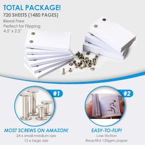 Papel flip book em branco com furos - 720 folhas (1480 páginas) papel de animação flipbook: funciona com kit flip book blocos de luz: para desenho, suprimentos de esboço/kit de quadrinhos - kit de - Criatividade ilimitada... Com nosso kit de papel flipbook premium, você maximiza sua criatividade e minimiza o tempo de tela. Você traz sua inspiração e ideias e nós fornecemos tudo o que você precisa para fazer seus próprios mini filmes de animação! Lindo papel dobrável de 11,4 cm x 6,3 cm e parafusos de encadernação de tamanhos diferentes para facilitar o processo - Tudo o que você precisa... Projetado por pessoas que trabalham em filmes de animação, temos o que você precisa. Nosso lindo papel flipbook pré-perfurado de 720 folhas (1480 páginas) vem com diferentes tamanhos de parafusos de encadernação de alta qualidade para animações de diferentes comprimentos - dando a você um conjunto completo para transformar seus sonhos em animação! - Sem frustração... Nós eliminamos a dor para que você aproveite ganhos criativos. Desenvolvemos nossas páginas de flip book para serem fáceis de virar, o que significa que não há mais limites em suas animações que os livros de encadernação costurados oferecem a você - Com páginas individuais, você decide - Rastreamento facilitado... Escolhemos nosso papel para ter a espessura perfeita - Compatível com canetas, lápis ou marcadores sem o vazamento de tinta que outros kits fornecem, enquanto é a espessura perfeita para virar. Também é compatível com uma fonte de luz, como blocos de luz flip book (não incluídos) para fazer as animações perfeitas - Paz de espírito... Com mais de 11 anos de experiência trabalhando em filmes, colocamos nosso coração e alma na criação de um kit de papel flipbook que superaria os outros e se adequaria a todos, de iniciantes a profissionais. Sabemos que você terá uma experiência incrível