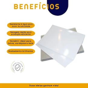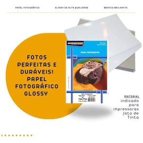 Principais características: - Tamanho: A4 210mm x 297mm - Cor: Branco - Acabamento: Glossy/Brilhante - Gramatura: 180g - Quantidade no Pacote: 50 folhas - À prova d'água - Secagem rápida