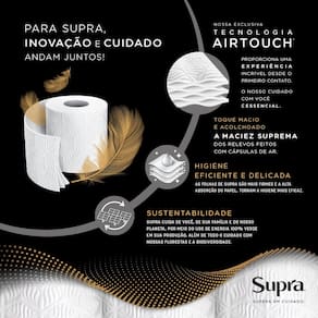 Supra cuida de você, da sua família e do nosso planeta, por meio de nossa fábrica que utiliza energia 100% verde em sua produção além de todo cuidado com nossas florestas.Experimente Supra e sinta a diferença em cada toque.Supra, cuidar bem de perto.