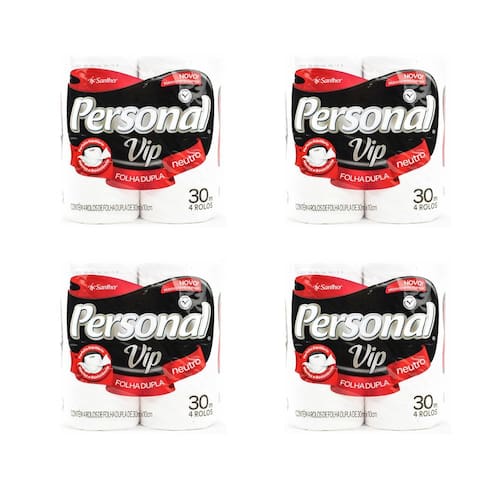 Sobre o produto Cada Pacote com 4 rolos de 30 metros cada Personal Vip é o papel higiênico folha dupla, que associa um perfeito equilíbrio entre Maciez e resistência , um produto macio como nunca, que traz para o dia a dia todo cuidado para você e sua família Ideal para atender os consumidores que procuram eficiência e um bom custo. Produto não perecível e não reutilizável. FOTOS MERAMENTE ILUSTRATIVAS