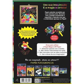 Papel Mágico A4 210X297Mm 5 Folhas Atenção: imagens meramente ilustrativas: Contém: 1 un - papel mágico a4 210x297mm 5 folhas. + incluso Papel colorido revestido por uma camada preta. Permite que você desenhe com o , já incluído no produto, arranhando a superfície e fazendo com que a criatividade apareça no papel. Para todas as idades. As crianças se divertem, os adultos relaxam e todos adoram - não tóxico. Dicas: 1 - desenhas apenas com o . 2 - não utilizar instrumentos de metal. 3 - não manuseie com as mãos molhadas. 4 - use e abuse da sua imaginação. Recomendações: - 5 folhas. - composição: celulose e plásticos. - validade: indeterminada. Medidas aproximadas: 210mm x 297 mm. Ean: 7808263598837
