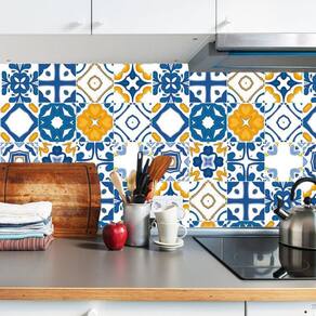Papel parede azulejo azul laranja adesivo cozinha lavatório
