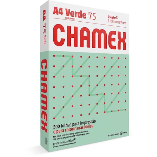Chamex Colors é um papel produzido com fibras virgens de eucalipto e tratadas com pigmentação especial, personalizado, papel mais colorido e divertido para realizar desenhos e imprimir diversos trabalhos. Sua superfície é resistente, possui corte perfeito e absorção equilibrada que permite o melhor deslizamento na impressora e alta performance em qualquer atividade.