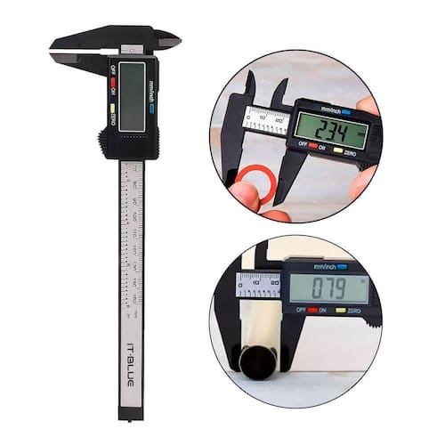 Capacidade: 150mm Faixa de medição 0-150mm Material: Plástico e metais eletrônicos Resolução: 0.1mm Precisão: 0.2mm Botão liga/desliga, zero e seleção mm/pol Display LCD de fácil visualização Bateria LR44 ou SR44